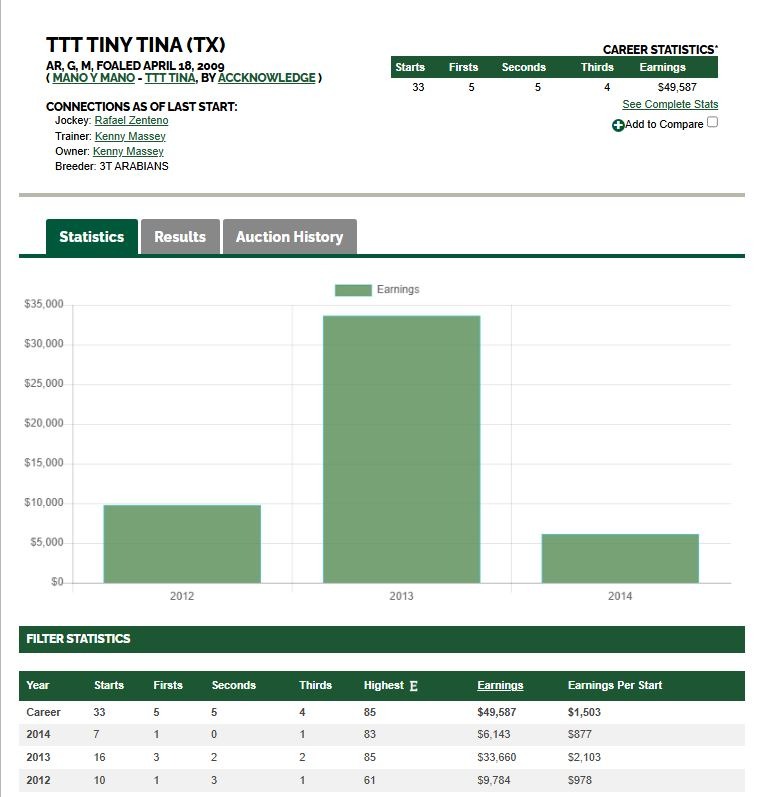 "Daisy" is showing the promise of her pedigree as she loves to run and she is FAST! She is a half-sister to TTT Tiny Tina, who did very well at the track and was nominated for the Darley Awards in 2013. She is also a full sister to TTT Little Whiz, who is showing promise as he begins his Endurance career this season.